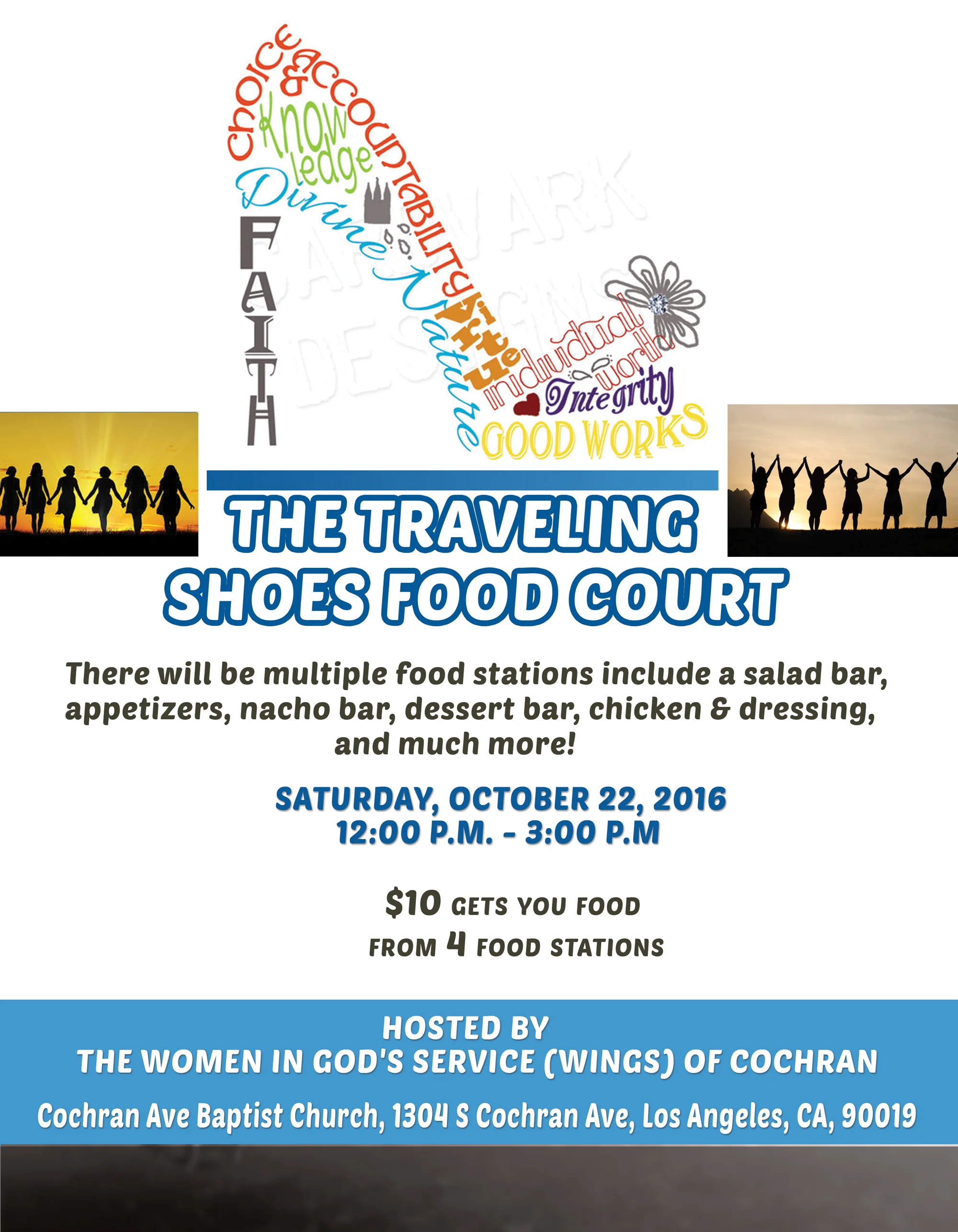 The Traveling Shoes Food Court Saturday, October 22, 2016 12:00 PM 3:00 PM 12:00 15:00 Cochran Baptist Church 1304 South Cochran Avenue Los Angeles, CA, 90019 United States (map) Google Calendar ICS Check out the food and fun at this fundraiser at Cochran Baptist Church! View fullsize