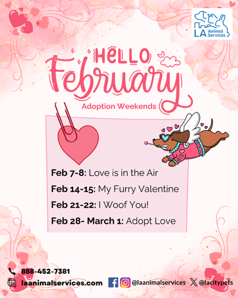 When you adopt a pet, you also Adopt Love! Visit LA Animal Services Centers during this event and adopt a dog, puppy, cat or kitten with reduced adoption fees at all six Centers: Adoption fees will be at a discount as follows-Dogs: $51 Puppies: $75.00, Cats: $12.50, Kittens $25