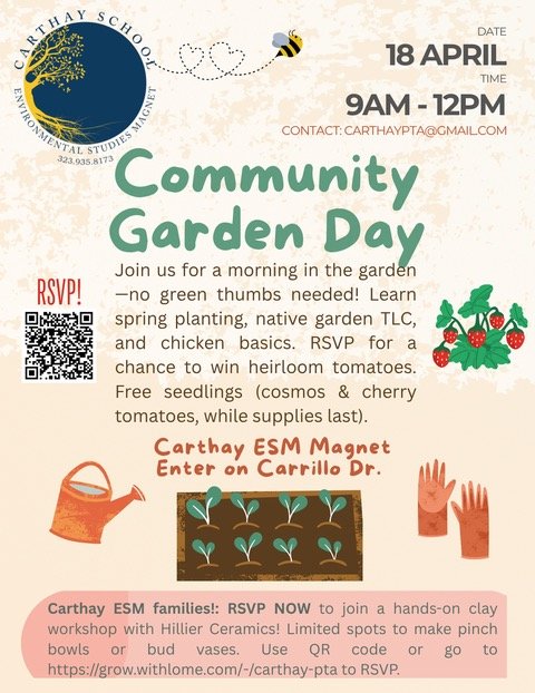 Carthay ESM Magnet is hosting a Community Garden Day on Saturday, April 18 from 9:00 AM to 12:00 PM (enter on Carrillo Dr.).