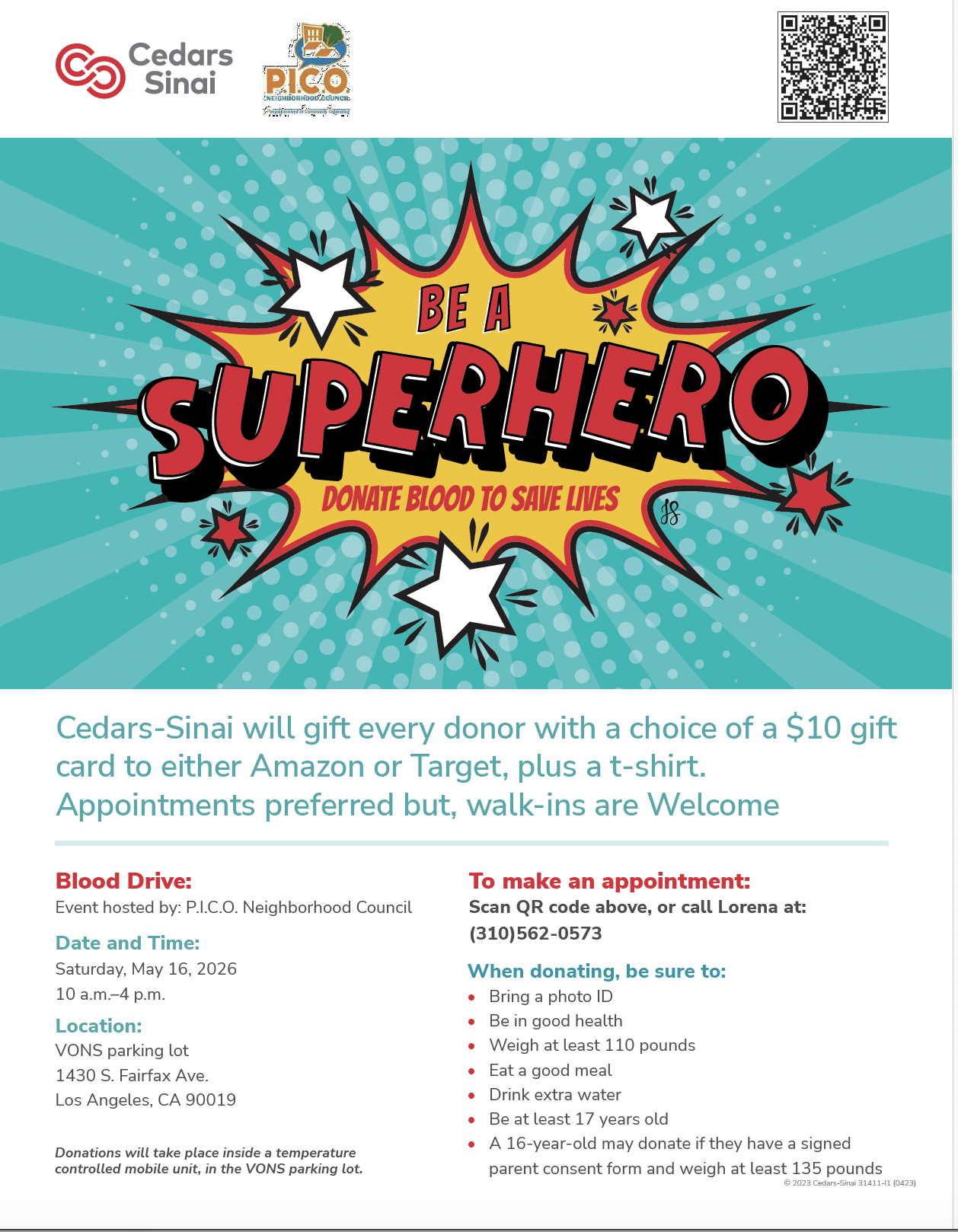 Join P.I.C.O. Neighborhood Council and Cedars-Sinai for a community Blood Drive and help make a life-saving difference.
